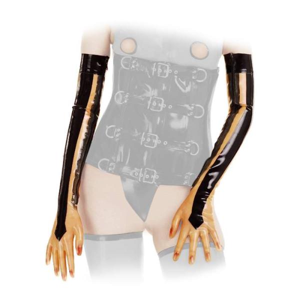 Diese hautengen, zweifarbigen langen Latex Handschuhe mit Reißverschluss der Marke