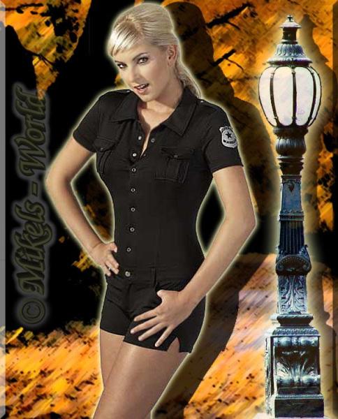 Das perfekte Outfit für die nächste Szene Party oder andere heiße Events!! Dieser schwarze enganliegende Einteiler mit Special Police-Abzeichen am linken Ärmel schmiegt sich hauteng an Ihren Körper und betont hervorragend Ihre weiblichen Kurven. Der scharfe Overall aus Stretchmaterial mit zwei aufgesetzen Fronttaschen besticht durch seine silberglänzenden Druckknöpfe in der Front für ein sexy Décolleté. Die knappen Hot-Pants mit Gürtelschlaufen, Reißverschluss und zwei Taschen vervollständigen Ihr Polizei Outfit. In dieser scharfen Cop-Uniform lässt sich mit Sicherheit jeder Mann gerne abführen.