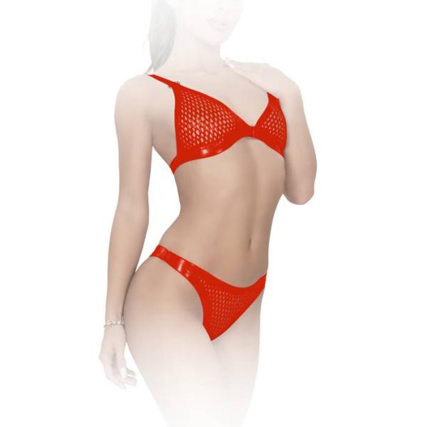 Ledapol ist mit seinem heißen Styling ein rasanter Kurvenbetoner und besticht durch seine extravagante Ausführung, bei welcher das Latex in markanter Netzform designed wurde. Der Netz BH ist in der Front mit einem gesonderten Verschluss versehen und der zugehörige Netz String wurde bei diesem Set ouvert gehalten. Gekonnt bedeckt es nur das nötigste und sorgt mit seinem raffinierten Netz-Design für erotische Einblicke. Das knappe Bikini-Set ist ein Must Have für jeden Fetisch und Latex Freund.