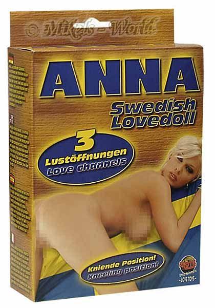 Lebensgroß aufblasbare Liebespuppe mit großen Brüsten und steifen Nippeln. Gesicht und blonde Haare sind aufgedruckt.