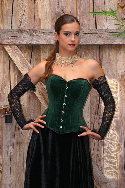 Dieses Original Schnür Korsett mit mehreren Spiralfedern und Stäbchen aus Edelstahl besteht von außen aus hochwertigem grünem Samt, welcher der Trägerin eine unvergleichliche Ausstrahlung verleiht. Auf der Vorderseite befindet sich eine stabile Edelstahl-Schließe mit Häkchenverschlüssen zum bequemen schnellen An- und Ausziehen und im Rücken sorgt eine Schnürung für einen hautengen, figurformenden Sitz. Eine extra eingearbeitete Rückenschutzlasche unterhalb der Schnürung garantiert Ihnen einen besonders hohen Tragekomfort und schont Ihren Rücken. Das Innenfutter ist zu 100% aus Baumwolle. Zu diesem Korsett gehören vier mit viel Liebe zum Detail gearbeitete Strapse aus Edelstahl, welche natürlich frei verstell- und abnehmbar sind. Alle Metallteile sind selbstverständlich nickelfrei. Das Vollbrustkorsett ist durch seine hochwertige Verarbeitung praktisch wie eine zweite Haut und lässt sich als elegantes Oberteil ideal mit vielen anderen Kleidungsstücken kombinieren. Ein wirklich traumhaftes Korsett der Luxusklasse!!