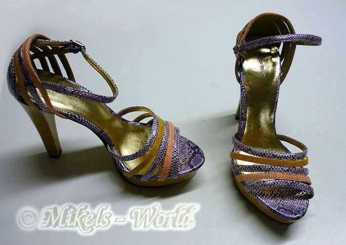 Diese sexy Riemchen Sandalette ist ein echtes Highlight und besticht durch ihre hinreißende Optik. Der traumhaft schöne Schuh verzaubert insbesondere durch sein extravagantes Plateau in lackierter Holzoptik und sorgt mit seinen vielen Riemchen im multicolor Schlangen-Design für einen perfekten Sitz. Die leicht profilierte Sohle sorgt bei diesem hocherotischen High Heel für einen sicheren Gang. Diese hochwertige Fesselriemchen Sandalette der Luxusklasse betont sehr weiblich Ihren Fuß und sorgt für einen unvergesslichen glänzenden Auftritt.
