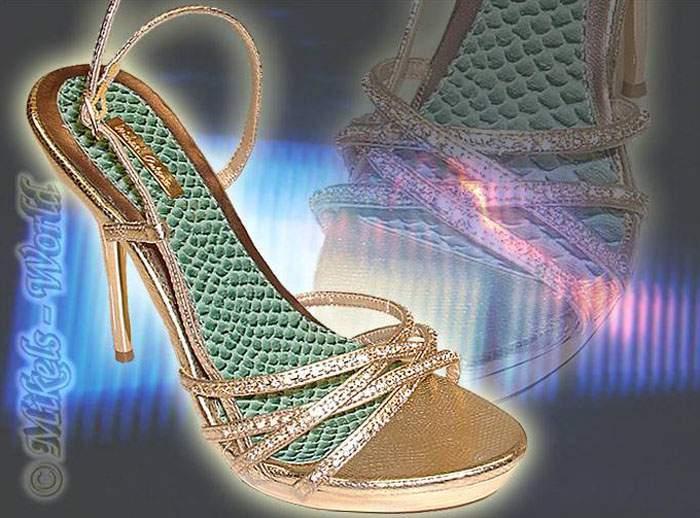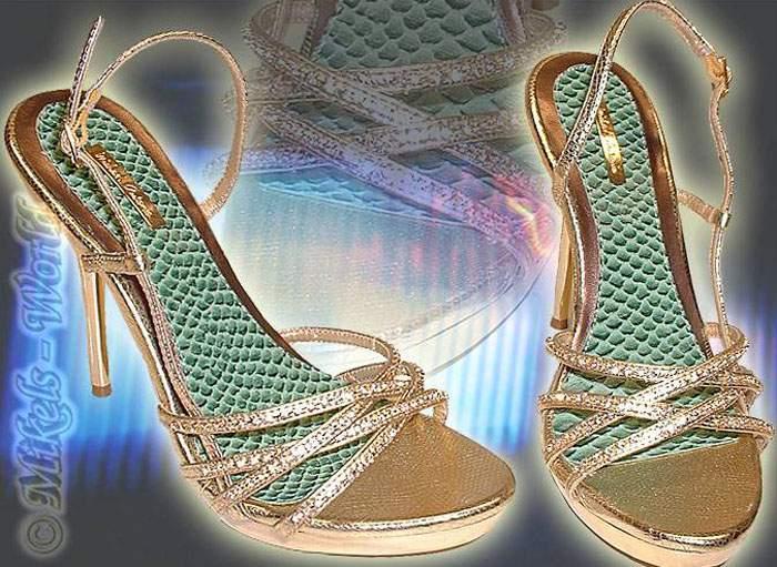 < Diese sensationelle Sandalette von Michael Antonio vereint Luxus und Eleganz in einem und besticht durch ihre atemberaubende Optik in edlem Gold. Der elegante Stiletto verzaubert insbesondere durch seinen stilvollen Strass-Steinchen-Besatz im Glamour Style, welcher verführerisch auf den kreuzförmig verlaufenden vorderen Riemchen funkelt. Echte Highlights sind das kleine Plateau, die türkisfarbene Innensohle im exotischen Python-Design sowie die effektvolle Struktur auf Außensohle und Absatz, die Sie zu einem unwiderstehlichen Eycatcher machen. Der hocherotische High Heel ist seitlich offen designed und verfügt über ein raffiniertes Fessel-Riemchen, welches einen sicheren Gang garantiert und Ihnen ein graziles Bein zaubert. Mit dem glänzenden Pfennigabsatz hinterlassen Sie garantiert einen bleibenden Eindruck. Diese hochwertige Sandalette der Luxusklasse betont sehr weiblich Ihren Fuß und sorgt für einen unvergesslichen glänzenden Auftritt.